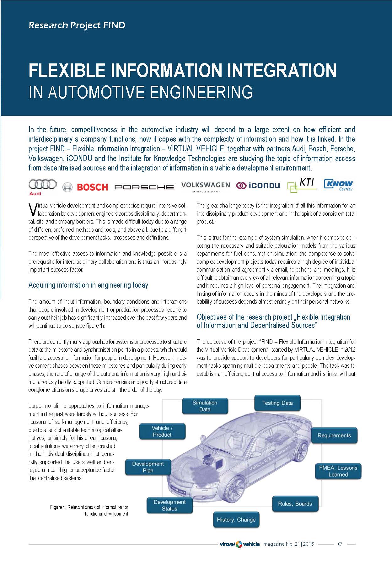 In the future, competitiveness in the automotive industry will depend to a large extent on how efficient and interdisciplinary a company functions, how it copes with the complexity of information and how it is linked. In the project FIND – Flexible Information Integration – VIRTUAL VEHICLE, together with partners Audi, Bosch, Porsche, Volkswagen, iCONDU and the Institute for Knowledge Technologies are studying the topic of information access from decentralised sources and the integration of information in a vehicle development environment.