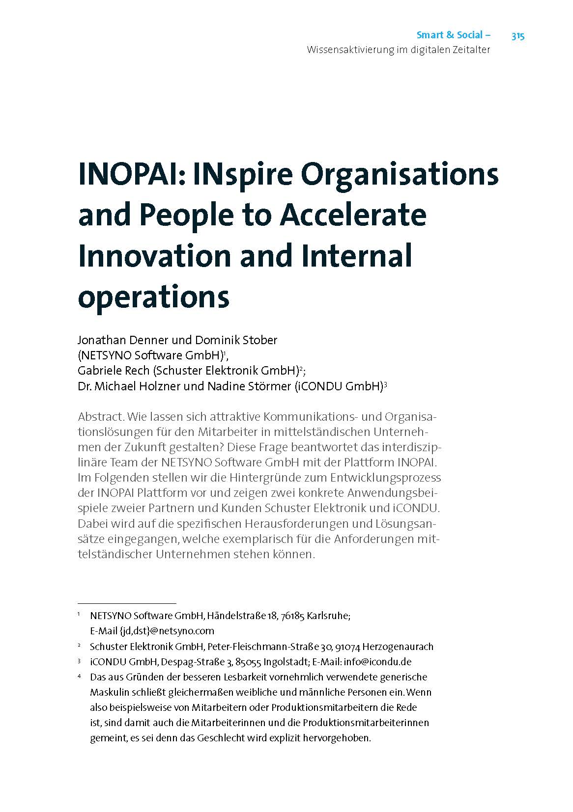Wie lassen sich attraktive Kommunikations- und Organisationslösungen für den Mitarbeiter in mittelständischen Unternehmen der Zukunft gestalten? Diese Frage beantwortet das interdisziplinäre Team der NETSYNO Software GmbH mit der Plattform INOPAI. Im Folgenden stellen wir die Hintergründe zum Entwicklungsprozess der INOPAI Plattform vor und zeigen zwei konkrete Anwendungsbeispiele zweier Partnern und Kunden Schuster Elektronik und iCONDU. Dabei wird auf die spezifischen Herausforderungen und Lösungsansätze eingegangen, welche exemplarisch für die Anforderungen mittelständischer Unternehmen stehen können.