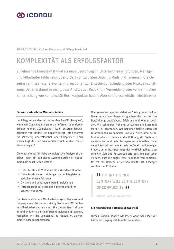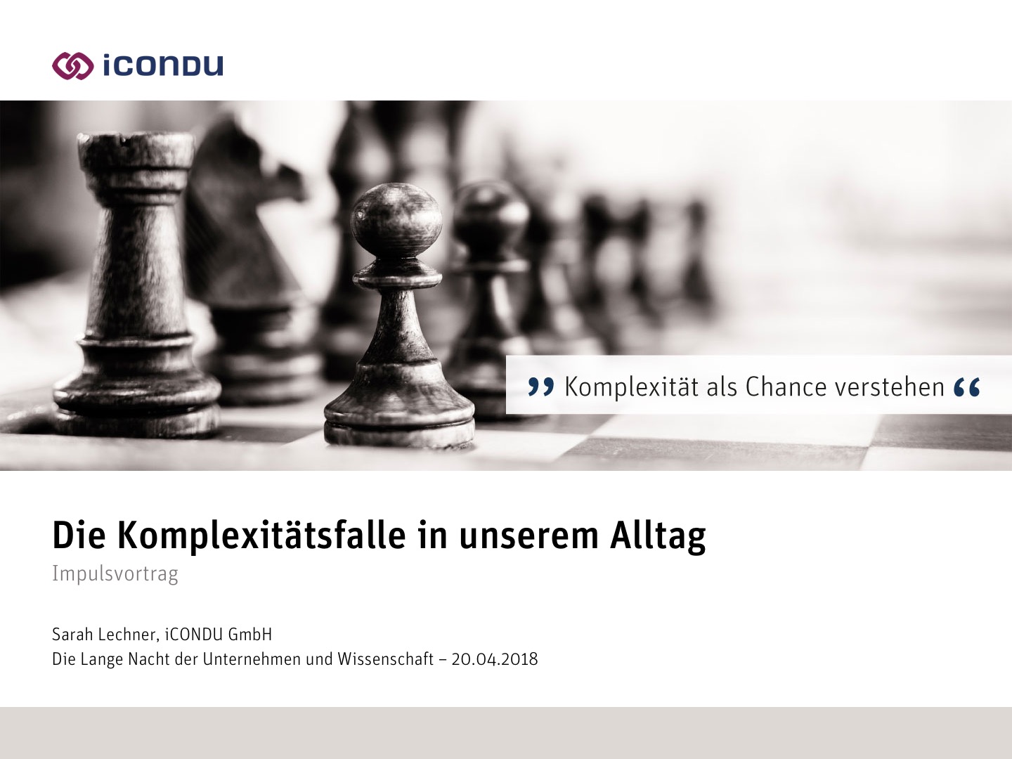 Unsere Welt wird durch die Digitalisierung, Globalisierung und die einhergehende Vernetzung zunehmend komplexer. Das betrifft jeden einzelnen von uns, aber vor allem Unternehmen und Organisationen. Um in diesem Umfeld erfolgreich zu sein, ist es notwendig, komplexe Systeme zunächst einmal als solche zu akzeptieren. So lassen sich nicht nur geeignete Herangehensweisen an komplexe Fragestellungen etablieren, sondern es wird uns auch gelingen, eine Organisationskultur zu fördern, die langfristig einen besseren Umgang mit Komplexität ermöglicht.