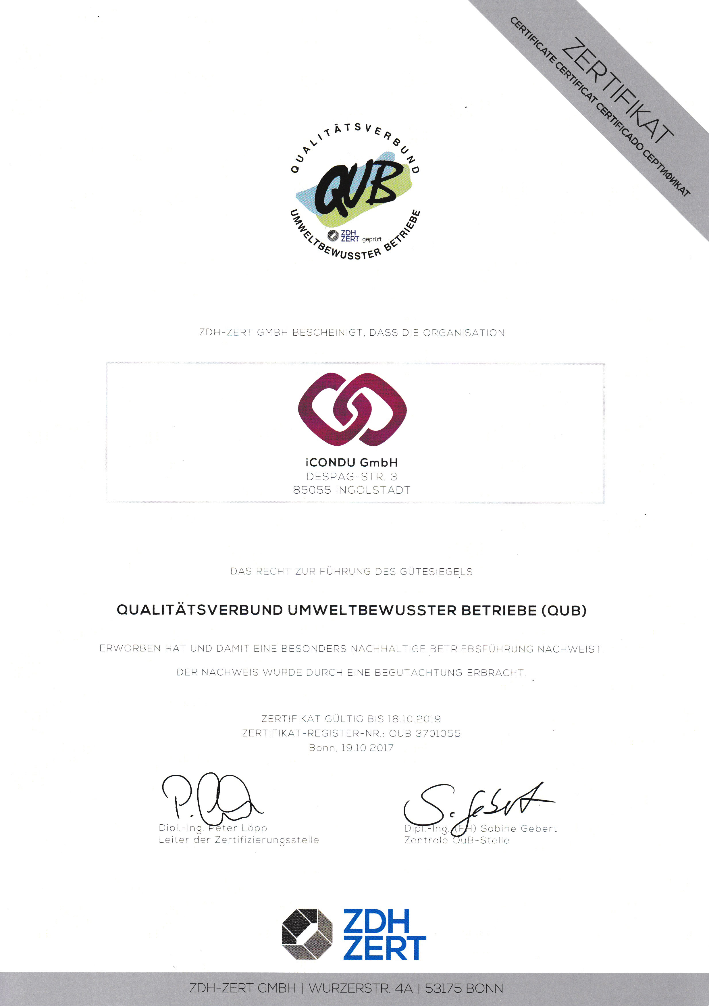 Seit Oktober 2017 ist das Umweltengagement der iCONDU GmbH auch zertifiziert. iCONDU ist Mitglied im Umweltpakt Bayern und im Qualitätsverbund umweltbewusster Betriebe (QuB).