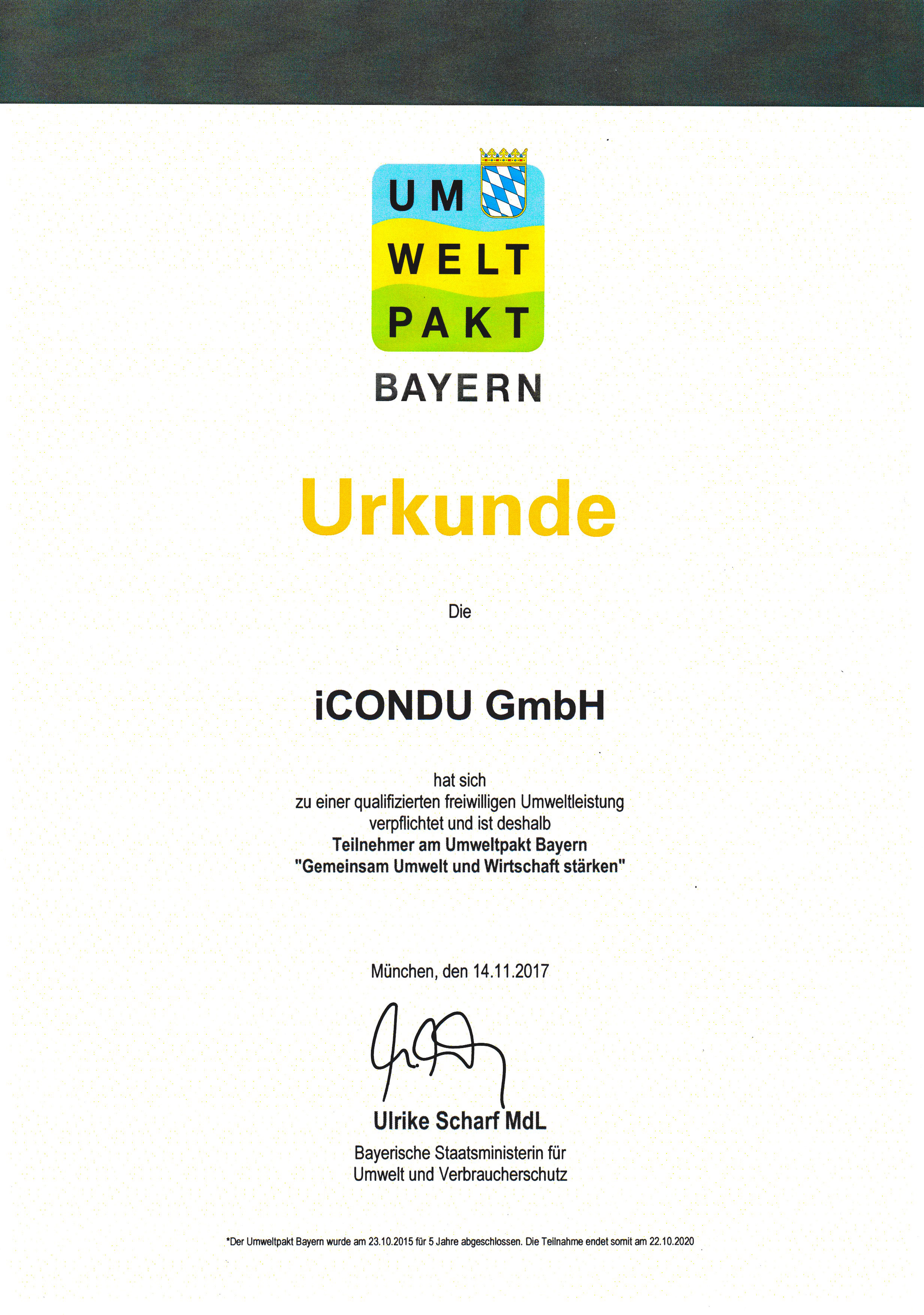 Bereits 2017 wurde iCONDU erstmalig Mitglied im Umweltpakt Bayern. Am 1. Oktober 2020 wurde dann der neue Umwelt- und Klimapakt 2020 von den Spitzenvertretern der Bayerischen Staatsregierung und der bayerischen Wirtschaft unterzeichnet. Ziel ist es, neue Impulse im Klimaschutz setzen, Lösungen im Umgang mit weiteren herausragenden Umwelt- und Nachhaltigkeitsthemen entwickeln und damit Umwelt- und Klimaschutz in Unternehmen und Betrieben voranbringen.