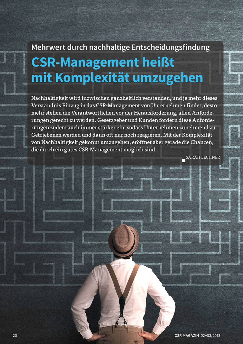Dem Thema Nachhaltigkeit gerecht zu werden, ist eine komplexe Herausforderung. An immer mehr Unternehmen wird aber genau diese Anforderung, egal ob es durch den Gesetzgeber oder den Kunden ist, gestellt. Gutes CSR-Management bedeutet dementsprechend mit dieser Komplexität von Nachhaltigkeit umgehen zu können und so die Chancen zu eröffnen, die das Thema mit sich bringt. Systemdenken ist die zentrale Fähigkeit, die Verantwortliche hierfür mitbringen müssen und eine Komplexitätskultur für Nachhaltigkeit unterstützt Unternehmen dabei das Thema gesamtheitlich in ihre Organisation zu integrieren.