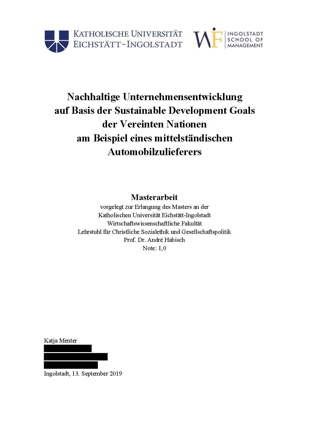 Katja Menter beschäftigte sich im Zuge ihres Studiums Betriebswirtschaftslehre – Entrepreneurship and Social Innovation in ihrer Masterarbeit mit der nachhaltigen Unternehmensentwicklung im Sinne der SDGs am Beispiel eines mittelständischen Automobilzulieferers. In der Kooperation des Lehrstuhls für christliche Sozialethik, dem mittelständischen Automobilzulieferer und der iCONDU GmbH unterstützten wir Katja Menter methodisch und inhaltlich zur nachhaltigen Transformation von Unternehmen und standen ihr als Sparringpartner zur Seite.