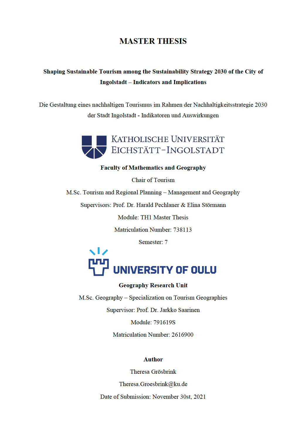 Masterarbeit: „Die Gestaltung eines nachhaltigen Tourismus im Rahmen der Nachhaltigkeitsstrategie 2030 der Stadt Ingolstadt“