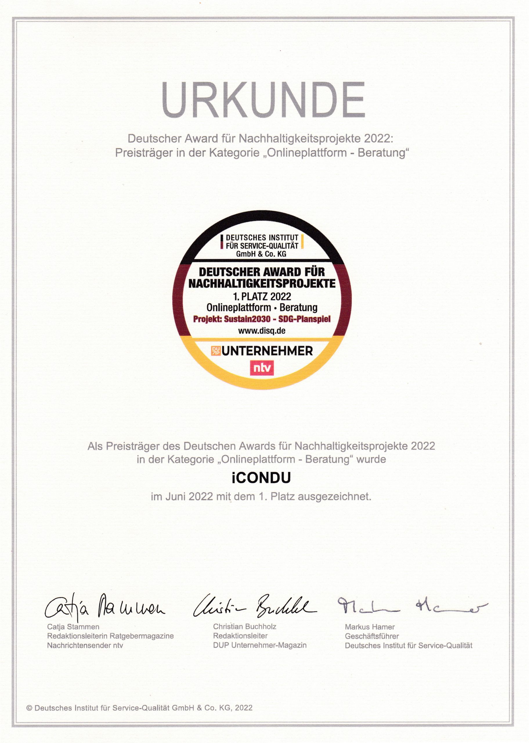 Im Juni 2022 wurde unser SDG-Planspiel Sustain2030® mit dem Deutschen Award für Nachhaltigkeitsprojekte 2022 des Deutschen Instituts für Service-Qualität ausgezeichnet. In der Kategroie „Online-Plattform • Beratung“ erzielte das Planspiel den 1. Platz. In der Jury-Bewertung heißt es: Die Jury begrüßt den Ansatz, der schwierige Wissensvermittlung in globaler