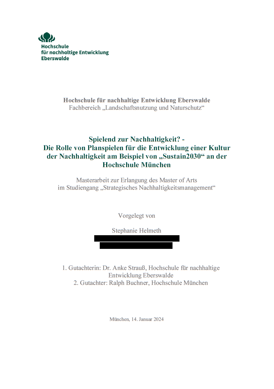 Masterarbeit: „Spielend zur Nachhaltigkeit? – Die Rolle von Planspielen für die Entwicklung einer Kultur der Nachhaltigkeit am Beispiel von „Sustain2030“ an der Hochschule München“