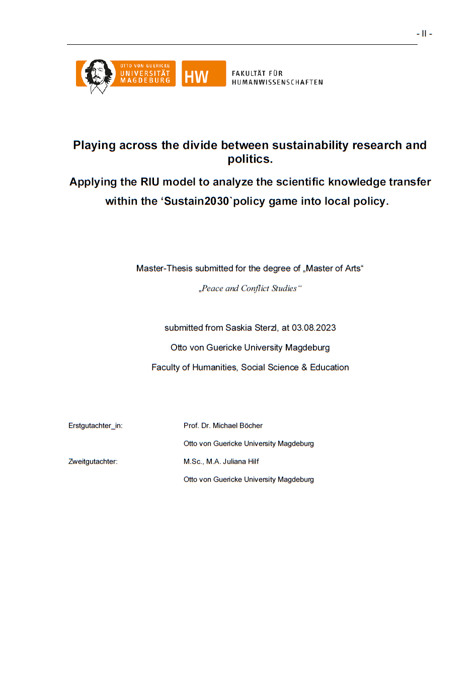 In ihrer Masterarbeit im Studiengang „Peace and Conflict Studies“ der Otto-von-Guericke-Universität Magdeburg untersuchte Saskia Sterzl die Eignung von des Planspiels Sustain2030 als Integrationstool, das den Transfer von wissenschaftlichen Erkenntnissen in die Politik zu verbessern soll. Die iCONDU GmbH unterstützte Saskia Sterzl bei dem Aufbau der Einzelfallstudie und durch die Teilnahme an Experteninterviews. Die Untersuchung anhand der Integrationskriterien des RIU-Modells (Research-Integration-Utilization) gibt einen ersten Hinweis darauf, dass Sustain2030 in der Lage ist, hochwertige wissenschaftliche Forschung einzubeziehen. Außerdem kann Sustain2030 die Partizipation und Bildung der Öffentlichkeit fördern und Unterstützung bei der Entscheidungsfindung bieten.
